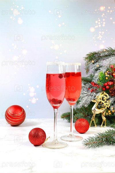 Рождественский алкогольный коктейль с красным шампанским Мимоза с клюквой в бокалах на праздничном фоне с еловыми ветками и украшениями, концепция бара, алкогольные напитки на вечеринке,
