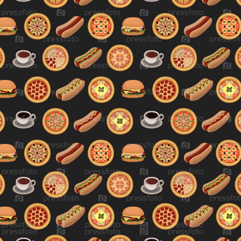 Бесшовный узор с различными круглыми пиццами, хот-догами, кофе, красным чаем в шахматном порядке на темном фоне