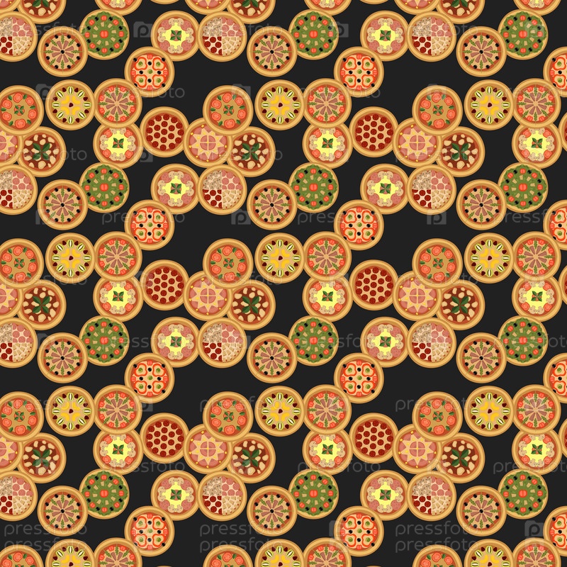 Бесшовный узор с различными круглыми пиццами, хаотично лежащими на темном фоне