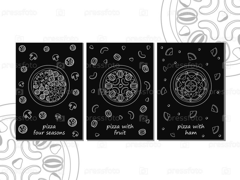Набор из трех плакатов для пиццы с белыми надписями: фрукты, мясо, грибы, четыре сезона на черном фоне