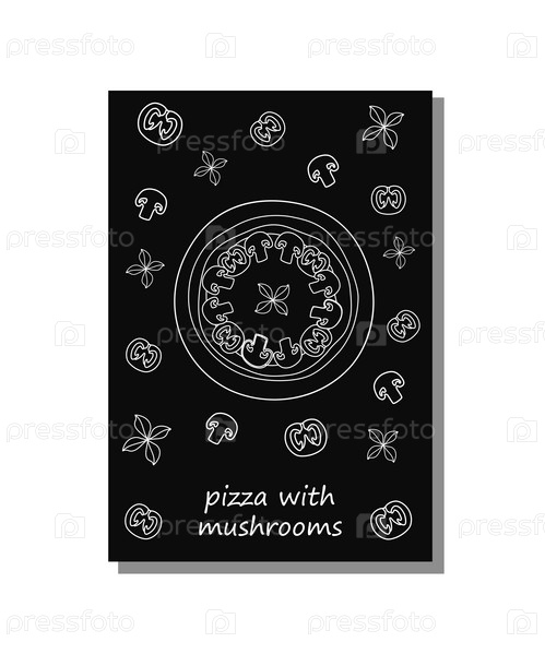 Плакат с пиццей, белый контур, подпись с грибами на черном фоне, помидоры, грибы, базилик