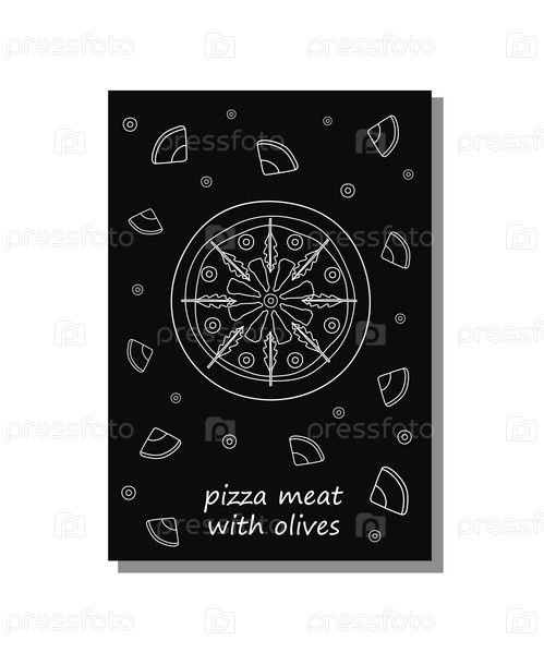 Плакат с пиццей с белым контуром и надписью «Мясо с оливками на черном фоне»