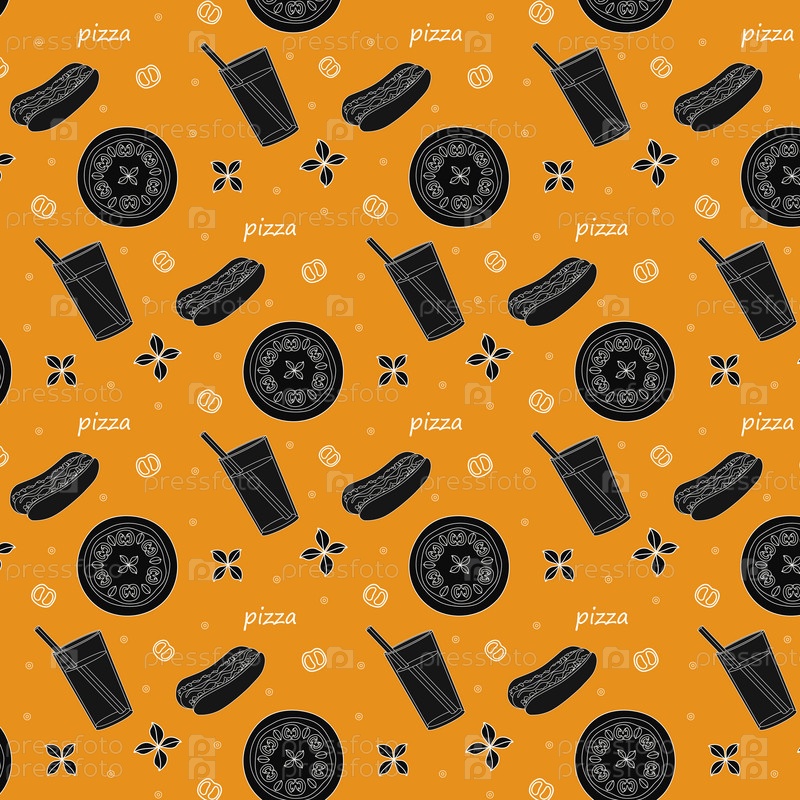 Бесшовный узор пицца, хот-дог, лимонад, помидоры черри, базилик, белый контур на ярко-оранжевом фоне