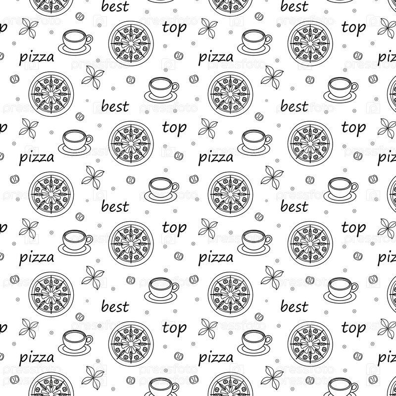 Бесшовный рисунок раскраски для детей с надписями лучшая пицца, кофейная чашка, черный контур на белом фоне