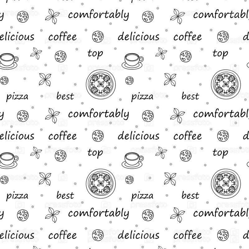 Бесшовный узор раскраски надписи уютная чашка кофе грибная пицца базилик черный контур на белом фоне