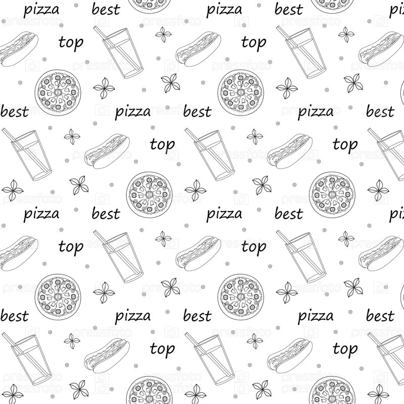 Бесшовный рисунок раскраски с пиццей Цезарь, хот-дог, лимонад, текст, помидоры черри, базилик, черный контур на белом фоне