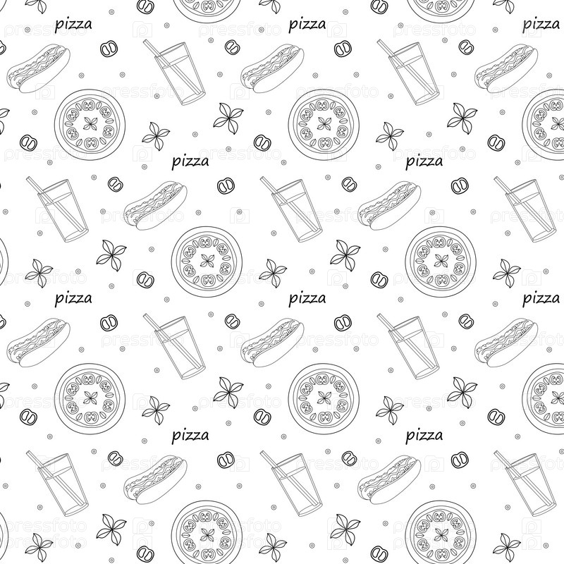 Бесшовный рисунок окраски с пиццей, хот-догом, лимонадом, помидорами черри, базиликом, черным контуром на белом фоне