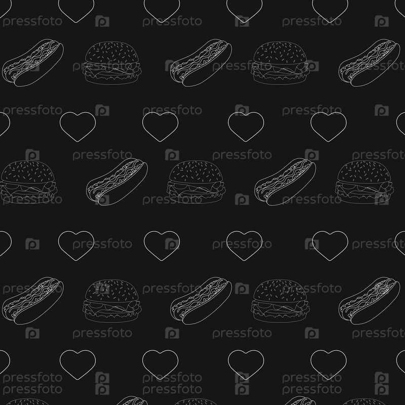 Бесшовный узор с гамбургерами, хот-догами, сердцами, белым контуром на темном фоне