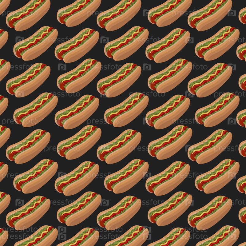 Бесшовный узор с хот-догом с соусами на темном фоне