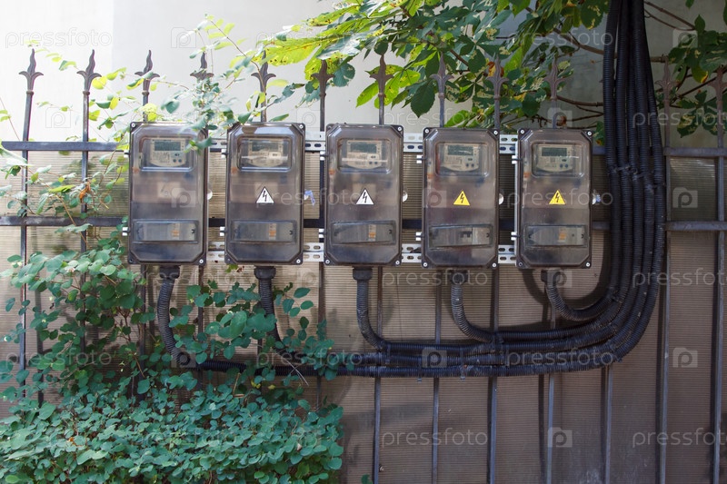 Уличные счетчики электроэнергии на городской улице в солнечный летний день