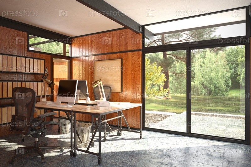 Современный интерьер домашнего офиса. 3D-рендеринг