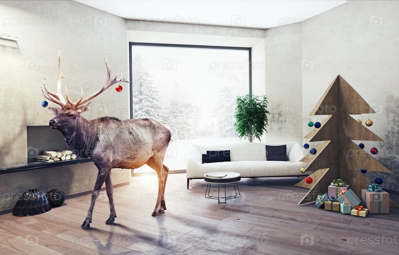 Интерьер с фанеровой елкой и оленем. 3D концепция