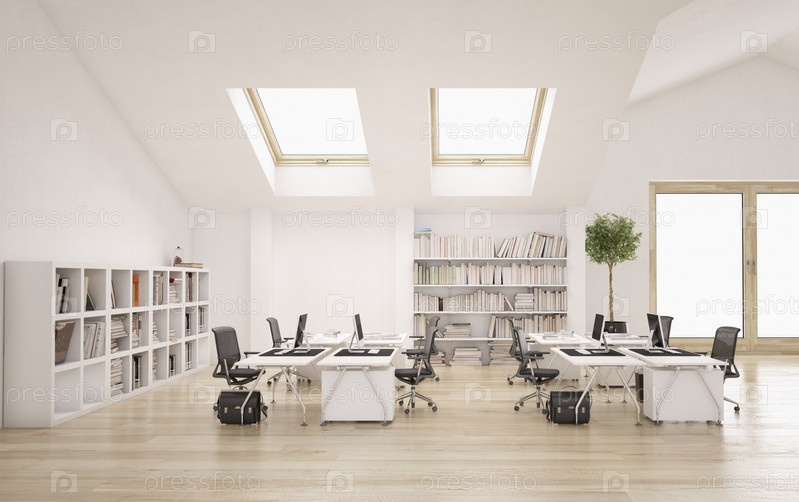 3D-интерьер светлого открытого офисного пространства. рендеринг концептуального дизайна
