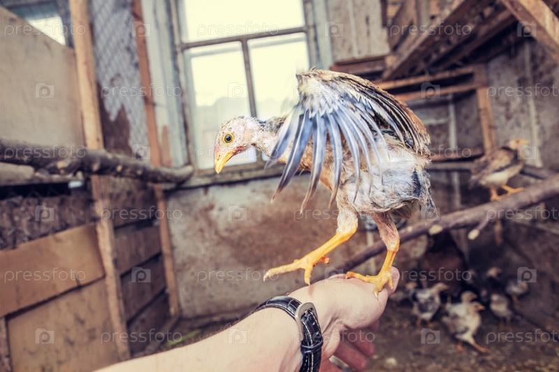 Молодой цыпленок сидит на руке мужчины в старом курятнике. Птицеферма