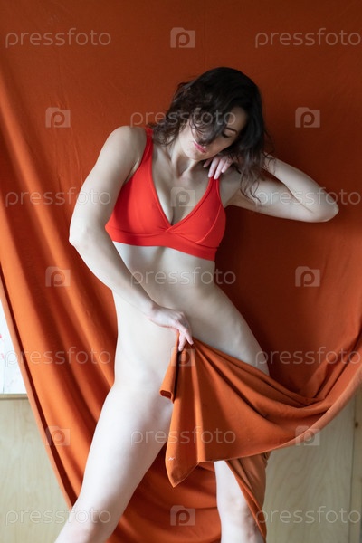 Молодая красивая женщина позирует в оранжевом нижнем белье в студии