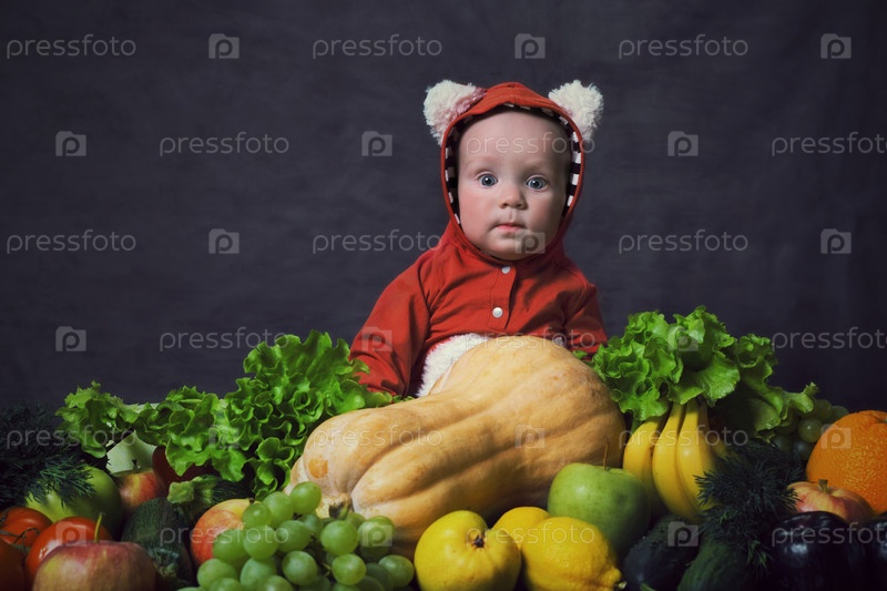 Маленький ребенок сидит рядом со свежими овощами и фруктами