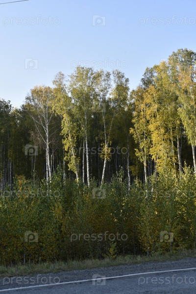 Желто-зеленый осенний красивый лес во второй половине дня. Красивый золотой лес рядом с дорогой
