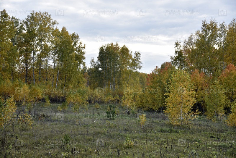 Желто-зеленый осенний красивый лес во второй половине дня. Красивый золотой лес рядом с дорогой
