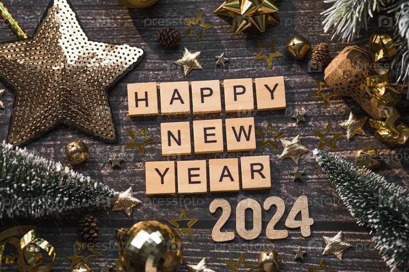 Открытка или баннер. Символ номера 2024 с золотыми шариками, звездами, блестками и красивым боке на деревянном фоне. С Новым 2024 годом. Концепция торжества