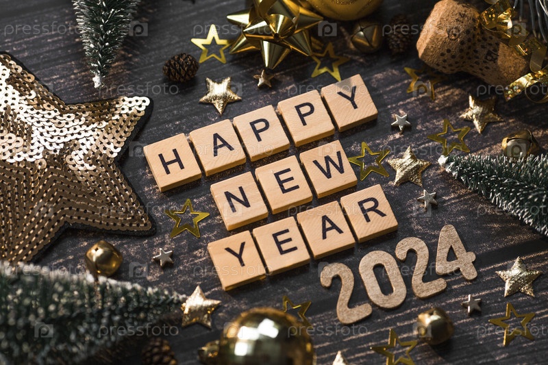 Открытка или баннер. Символ номера 2024 с золотыми шариками, звездами, блестками и красивым боке на деревянном фоне. С Новым 2024 годом. Концепция торжества