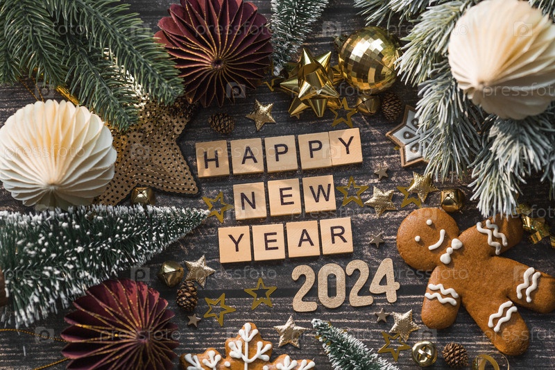Открытка или баннер. Символ номера 2024 с бумажными елочными игрушками, звездами, пряниками и красивым боке на деревянном фоне. С Новым 2024 годом. Концепция торжества