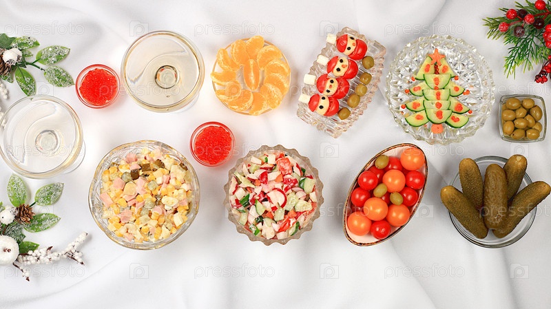 Рождественские новогодние блюда, традиционный салат Оливье, овощной салат из огурцов, помидоров и редиса и разнообразные овощные закуски, концепция праздничной сервировки