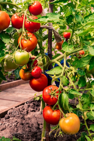 Красные спелые помидоры на стебле в теплице. Сбор помидоров, овощей