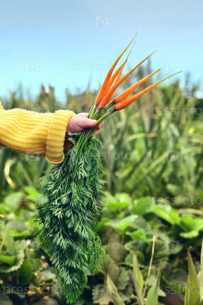 Ребенок держит в руке только что сорванную молодую морковь. Овощи в саду