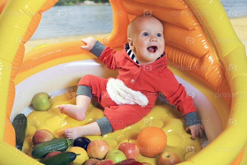 Веселый ребенок летом на пляже в надувном домике с фруктами
