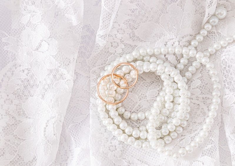 Два золотых обручальных кольца лежат на роскошной винтажной части свадебного платья невесты с ниткой жемчужных бус. Концепция свадьбы. Вид сверху