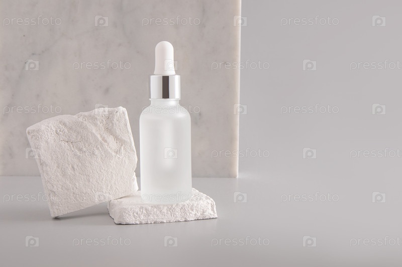 Косметическая сыворотка для ухода за кожей лица в белой матовой бутылке с капельницей на сером фоне с пластинами из белого кирпича. Передний план. Презентация продукта