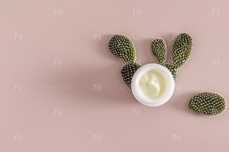 Белая баночка натурального крема для ухода за кожей лица и тела среди толстых сочных листьев кактуса. Вид сверху. Копировальное пространство. Бежевый фон. Органическая косметика