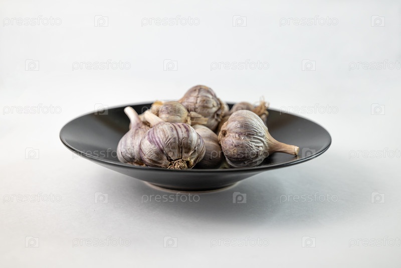 Несколько головок чеснока лежат в черной тарелке на белом фоне