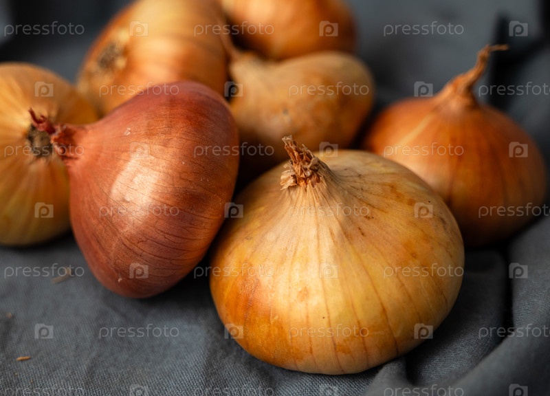 Лук кучей лежит на серой ткани на столе крупным планом