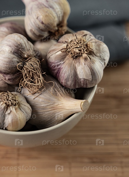 Чеснок лежит в керамической миске крупным планом