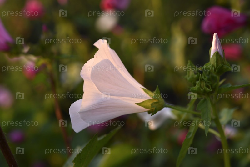 Красивые яркие цветы лаватеры в летнем саду на закате. Лаватера триместрис. Сочные цветы мальвы