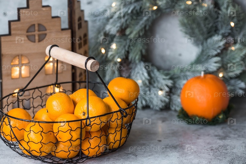 Рождественский новогодний фон с мандаринами в ретро-металлической корзине на сером фоне. Цитрусовые. Праздничные угощения и украшения. Русские традиции