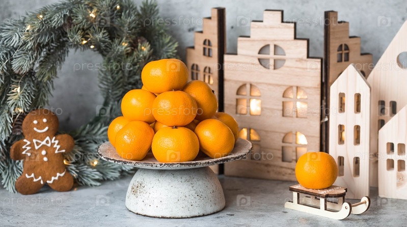 Рождественский новогодний фон с мандаринами, игрушками, деревянными домиками и еловым венком с гирляндой. Праздничные угощения и украшения. Русские традиции