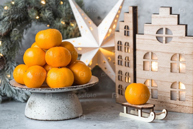 Рождественский новогодний фон с мандаринами, игрушками, деревянными домиками и еловым венком с гирляндой. Праздничные угощения и украшения. Русские традиции