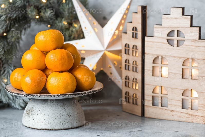 Рождественский новогодний фон с мандаринами, игрушками, деревянными домиками и еловым венком с гирляндой. Праздничные угощения и украшения. Русские традиции