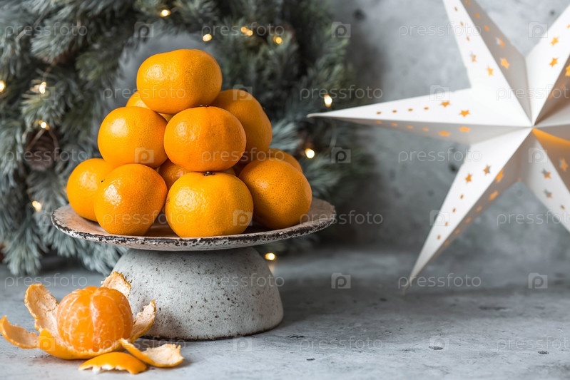 Рождественский новогодний фон с мандаринами, игрушками, деревянными домиками и еловым венком с гирляндой. Праздничные угощения и украшения. Русские традиции