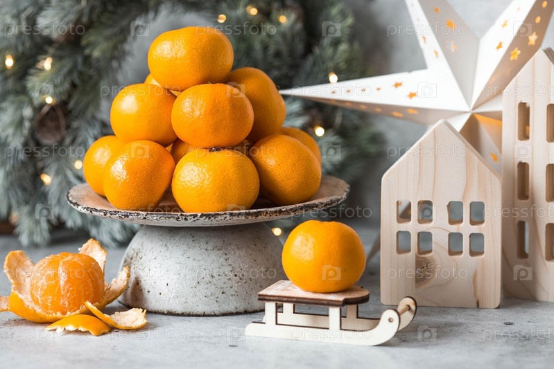 Рождественский новогодний фон с мандаринами, игрушками, деревянными домиками и еловым венком с гирляндой. Праздничные угощения и украшения. Русские традиции