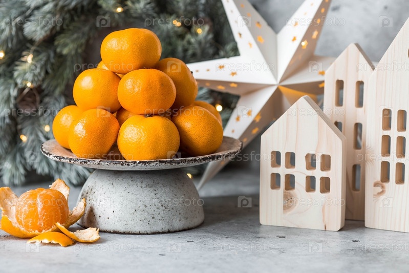 Рождественский новогодний фон с мандаринами, игрушками, деревянными домиками и еловым венком с гирляндой. Праздничные угощения и украшения. Русские традиции