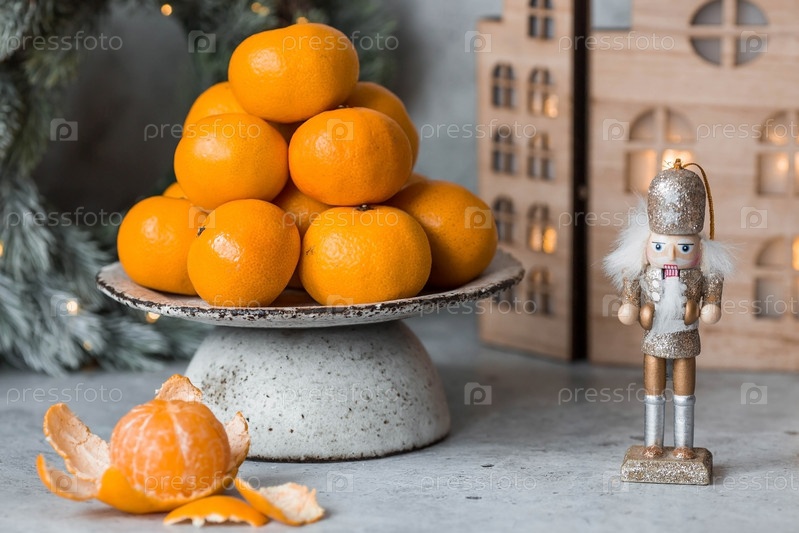 Рождественский новогодний фон с мандаринами, игрушками, деревянными домиками и еловым венком с гирляндой. Праздничные угощения и украшения. Русские традиции