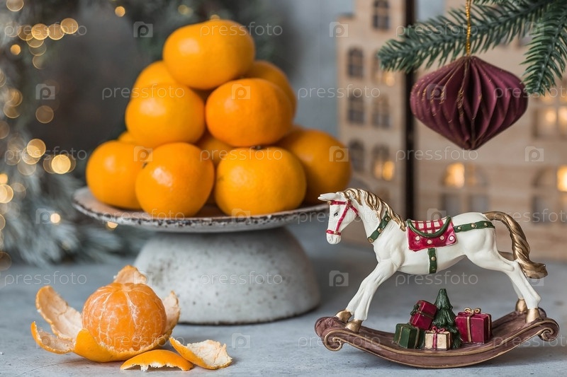 Рождественский новогодний фон с мандаринами, игрушками, деревянными домиками и еловым венком с гирляндой. Праздничные угощения и украшения. Русские традиции