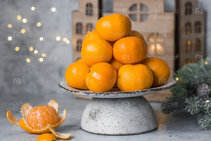 Рождественский новогодний фон с мандаринами, игрушками, деревянными домиками и еловым венком с гирляндой. Праздничные угощения и украшения. Русские традиции