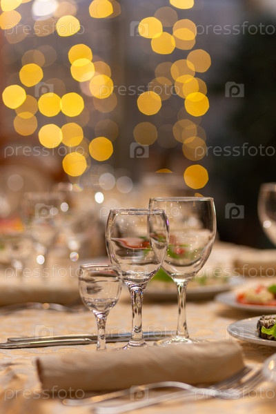 Сервированный праздничный стол с закусками, бокалами, бокалами, столовыми приборами и салфетками для банкета по случаю свадьбы или дня рождения или Рождества или другого яркого события в ресторане