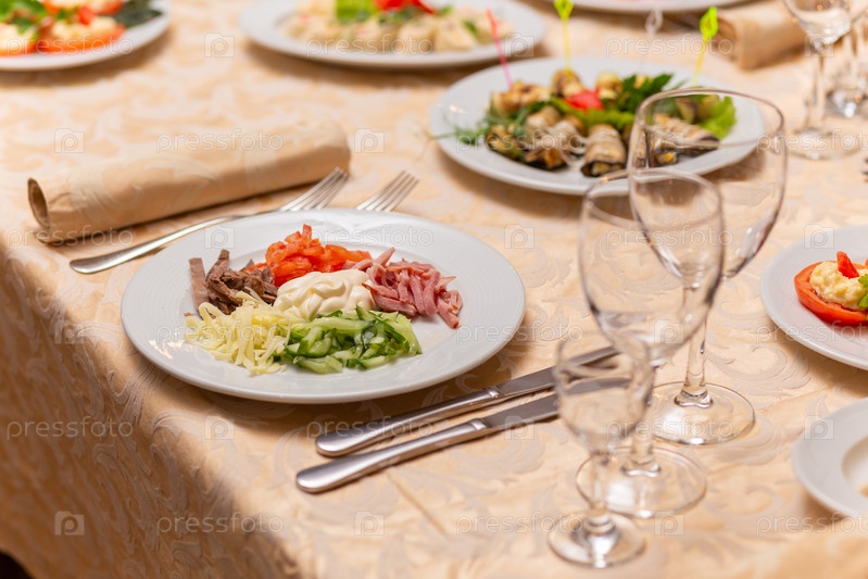 Сервированный праздничный стол с закусками, бокалами, бокалами, столовыми приборами и салфетками для банкета по случаю свадьбы или дня рождения или Рождества или другого яркого события в ресторане