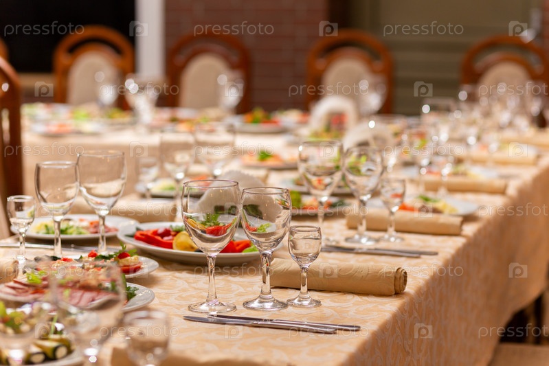 Сервированный праздничный стол с закусками, стаканами, стаканами, столовыми приборами и салфетками для банкета