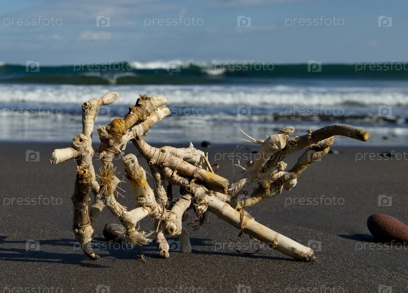 Россия. Дальний Восток, Курильские острова. Природный ландшафт с причудливой корягой на прибрежном вулканическом песке Тихого океана